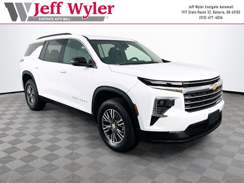 Jeff Wyler Eastgate Auto Mall is very proud to offer this fantastic 2025 Chevrolet Traverse LT in Summit White. Well equipped with: Preferred Equipment Group 1LT, 3rd row seats: split-bench, 4-Way Manual Front Passenger Seat Adjuster, 4-Wheel Disc Brakes, 6 Speakers, 6-Speaker Audio System Feature, 8-Way Power Driver Seat Adjuster, ABS brakes, Air Conditioning, Alloy wheels, AM/FM radio: SiriusXM with 360L, Apple CarPlay/Android Auto, Auto High-beam Headlights, Automatic temperature control, Brake assist, Bumpers: body-color, Child-Seat-Sensing Airbag, Compass, Delay-off headlights, Driver door bin, Driver vanity mirror, Dual front impact airbags, Dual front side impact airbags, Electronic Stability Control, Emergency communication system: OnStar, Four wheel independent suspension, Front anti-roll bar, Front Bucket Seats, Front Center Armrest, Front dual zone A/C, Front reading lights, Fully automatic headlights, Heated door mirrors, Heated front seats, Heated steering wheel, Illuminated entry, Low tire pressure warning, Navigation System, Occupant sensing airbag, Outside temperature display, Overhead airbag, Overhead console, Panic alarm, Passenger door bin, Passenger vanity mirror, Power door mirrors, Power driver seat, Power Liftgate, Power steering, Power windows, Premium Cloth Seat Trim, Radio data system, Radio: : Audio System w/17.7" Diagonal Display, Rear air conditioning, Rear anti-roll bar, Rear reading lights, Rear window defroster, Rear window wiper, Remote keyless entry, Security system, SiriusXM with 360L Trial Subscription, Speed control, Speed-sensing steering, Spoiler, Steering wheel mounted audio controls, Tachometer, Telescoping steering wheel, Tilt steering wheel, Traction control, Trip computer, Turn signal indicator mirrors, Variably intermittent wipers, Voltmeter, and Wheels: 18" Grazen Metallic Machined-Face Aluminum. CARFAX One-Owner. Certified. Chevrolet Certified Pre-Owned Details: * Powertrain Limited Warranty: 72 Month/100,000 Mile (whichever comes first) from original in-service date * Transferable Warranty * 172 Point Inspection * 24 months/24,000 miles (whichever comes first) Certified Pre-Owned Scheduled Maintenance Plan and 3 days/150 miles (whichever comes first) Vehicle Exchange Program. SiriusXM 3-month trial subscription. * Warranty Deductible: $0 * Vehicle History * Roadside Assistance * Limited Warranty: 12 Month/12,000 Mile (whichever comes first) from certified purchase dateAsk about available certifications. Used vehicles 10 years of age or newer with less than 100,000 miles are eligible for the Wyler Assurance Program, but eligible vehicles must pass our reconditioning process and multi-point inspection. Provided the vehicle passes inspection, vehicles will be eligible for the 6 month/6,000 mile limited warranty. The 6 month/6,000 mile limited warranty is NOT available on AS-IS vehicles, wholesale vehicles, lease buyback/pass-thru vehicles or un-inspected vehicles. Note that this program can also apply to vehicles where the remaining factory coverage is less than 6 months or 6,000 miles. Please check the Federal Trade Commission (FTC) Buyers guide on the vehicle for full details as to whether or not warranty coverage may apply. Contact Dealer for additional details. The Wyler Assurance 6 month/6,000 Mile limited warranty ends 6 months from the date of the Retail Purchase Agreement (BUYERS ORDER) or when the vehicle's odometer registers 6,000 additional miles to the mileage listed on the BUYERS ORDER, whichever comes first. Your Deductible - The warranty holder on your contract pays the first $100 of each covered repair.