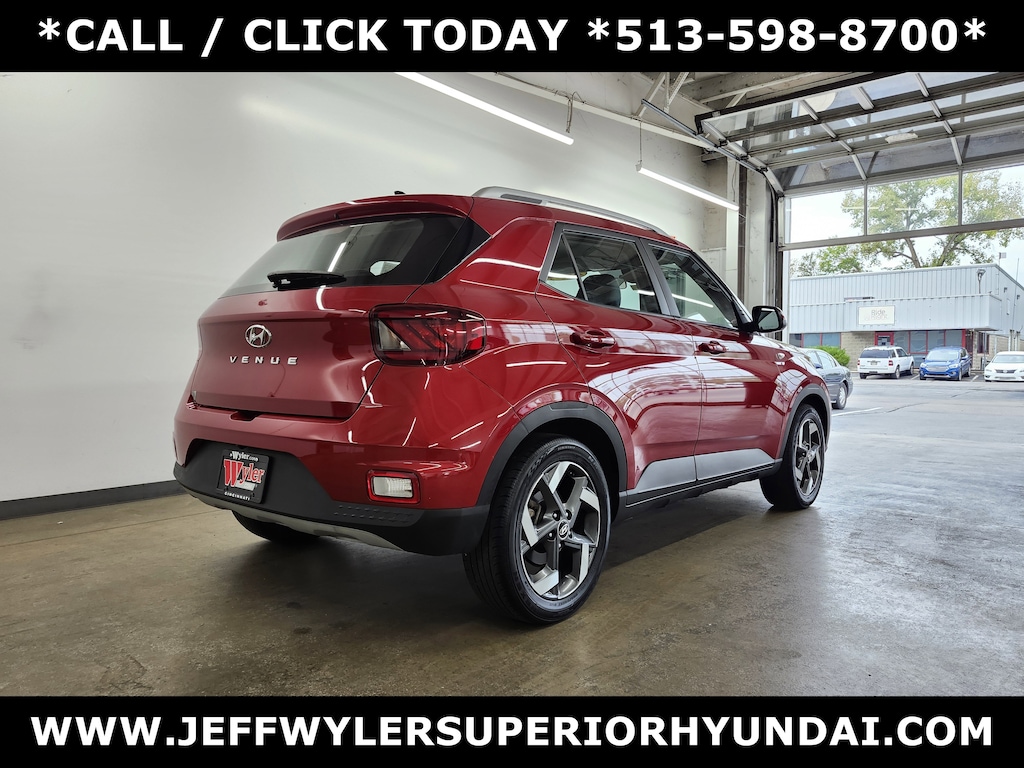Jeff Wyler Superior Hyundai is honored to offer this charming 2022 Hyundai Venue Limited in Scarlet Red Pearl. Well equipped with: Cargo Package (Cargo Blocks, Cargo Net, and Cargo Tray), Option Group 01, 4-Wheel Disc Brakes, 6 Speakers, 6.483 Axle Ratio, 6.5J x 17" Alloy Wheels, ABS brakes, Air Conditioning, Alloy wheels, AM/FM radio: SiriusXM, Apple CarPlay & Android Auto, Auto High-beam Headlights, Automatic temperature control, Brake assist, Bumpers: body-color, Carpeted Floor Mats, Cloth Seat Trim, Delay-off headlights, Driver door bin, Driver vanity mirror, Dual front impact airbags, Dual front side impact airbags, Electronic Stability Control, Emergency communication system, First Aid Kit, Front anti-roll bar, Front Bucket Seats, Front Center Armrest, Front reading lights, Front wheel independent suspension, Fully automatic headlights, Heated door mirrors, Heated Front Bucket Seats, Heated front seats, Illuminated entry, Leather Shift Knob, Leather steering wheel, Low tire pressure warning, Navigation System, Occupant sensing airbag, Outside temperature display, Overhead airbag, Overhead console, Panic alarm, Passenger door bin, Passenger vanity mirror, Power door mirrors, Power steering, Power windows, Radio: AM/FM/HD/SiriusXM Display Audio, Rear Seat Cup Holder, Rear window defroster, Rear window wiper, Remote keyless entry, Roof rack: rails only, Security system, Speed control, Speed-sensing steering, Split folding rear seat, Spoiler, Steering wheel mounted audio controls, Tachometer, Telescoping steering wheel, Tilt steering wheel, Traction control, Trip computer, and Variably intermittent wipers. Clean CARFAX. This sales price excludes tax, title, and dealer fees. While every reasonable effort is made to ensure the accuracy of this information, we are not responsible for any errors or omissions contained on these pages. Used vehicles 10 years of age or newer with less than 100,000 miles are eligible for the Wyler Assurance Program, but eligible vehicles must pass our reconditioning process and multi-point inspection. Provided the vehicle passes inspection, vehicles will be eligible for the 6 month/6,000 mile limited warranty. The 6 month/6,000 mile limited warranty is NOT available on AS-IS vehicles, wholesale vehicles, lease buyback/pass-thru vehicles or un-inspected vehicles. Note that this program can also apply to vehicles where the remaining factory coverage is less than 6 months or 6,000 miles. Please check the Federal Trade Commission (FTC) Buyers guide on the vehicle for full details as to whether or not warranty coverage may apply. Contact Dealer for additional details. The Wyler Assurance 6 month/6,000 Mile limited warranty ends 6 months from the date of the Retail Purchase Agreement (BUYERS ORDER) or when the vehicle's odometer registers 6,000 additional miles to the mileage listed on the BUYERS ORDER, whichever comes first.Your Deductible - The warranty holder on your contract pays the first $100 of each covered repair.