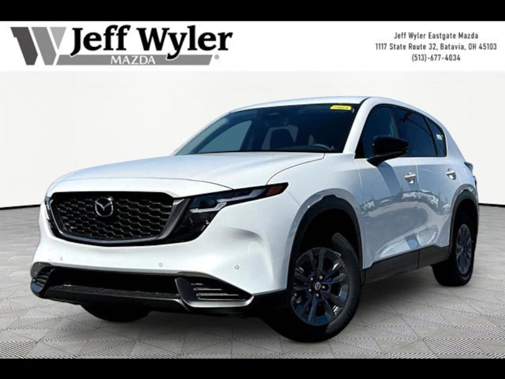 Rhodium White Metallic 2026 Mazda CX-5 2.5 S Select SKYACTIV®-G 2.5L 4-Cylinder DOHC 16V AWD 6-Speed Automatic Jeff Wyler Eastgate Auto Mall is delighted to offer this fantastic-looking 2026 Mazda CX-5 2.5 S Select in Rhodium White Metallic. Well equipped with: 4-Wheel Disc Brakes, 8 Speakers, ABS brakes, Air Conditioning, Alloy wheels, AM/FM radio, AppLink/Apple CarPlay and Android Auto, Auto High-beam Headlights, Auto-dimming Rear-View mirror, Automatic temperature control, Brake assist, Bumpers: body-color, Cargo Tray, Compass, Delay-off headlights, Driver door bin, Driver vanity mirror, Dual front impact airbags, Dual front side impact airbags, Electronic Stability Control, Emergency communication system: 911 Emergency Notification, Exterior Parking Camera Rear, Four wheel independent suspension, Front and Rear Splash Guards, Front anti-roll bar, Front Bucket Seats, Front Center Armrest w/Storage, Front dual zone A/C, Front reading lights, Fully automatic headlights, Heated door mirrors, Illuminated entry, Knee airbag, Leather Shift Knob, Leather steering wheel, Leatherette Seat Trim with Microsuede Insert, Low tire pressure warning, Navigation system: Google built-in, Occupant sensing airbag, Outside temperature display, Overhead airbag, Overhead console, Panic alarm, Passenger door bin, Passenger vanity mirror, Power door mirrors, Power steering, Power windows, Radio data system, Radio: AM/FM/HD Audio System, Rain sensing wipers, Rear anti-roll bar, Rear reading lights, Rear seat center armrest, Rear window defroster, Rear window wiper, Remote keyless entry, Rhodium White Premium Paint Charge, Speed control, Speed-sensing steering, Split folding rear seat, Spoiler, Steering wheel mounted audio controls, Tachometer, Telescoping steering wheel, Tilt steering wheel, Traction control, Trip computer, Turn signal indicator mirrors, Variably intermittent wipers, Wheel Locks, and Wheels: 17 x 7J Aluminum Alloy.
