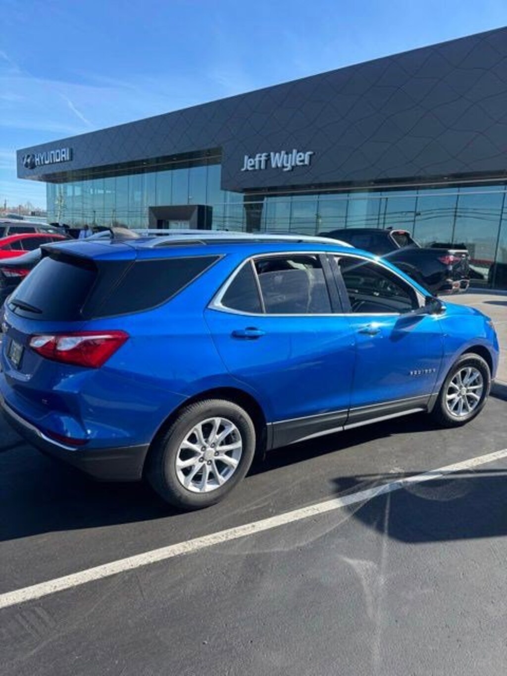 Clean CARFAX. Jeff Wyler Hyundai of Fairfield is delighted to offer this beautiful 2019 Chevrolet Equinox LT in Kinetic Blue Metallic. Well equipped with: Confidence & Convenience Package, Driver Confidence Package (Lane Change Alert w/Side Blind Zone Alert, Outside Heated Power-Adjustable Mirrors, Rear Cross Traffic Alert, and Rear Park Assist w/Audible Warning), Driver Convenience Package (3-Spoke Leather-Wrapped Steering Wheel, Dual Zone Automatic Climate Control, Heated Driver & Front Passenger Seats, Leather-Wrapped Shift Lever, Rear Power Liftgate, Remote Vehicle Starter System, and Universal Home Remote), Floor Liner Package (LPO) (All-Weather Floor Liners (LPO) and Integrated Cargo Liner (LPO)), Infotainment Package (120-Volt Power Outlet, 2 USB Data Ports, 2 USB Data Ports w/SD Card Reader, HD Rear Vision Camera, and Radio: Chevrolet Infotainment 3 Plus System w/Navi), Preferred Equipment Group 1LT, Sun & Navigation Package (DISC) (Power Sunroof and Roof-Mounted Luggage Rack Side Rails), Android Auto, Apple CarPlay, CALL NOW FOR YOUR VIP APPOINTMENT 513-870-9800, FULLY SERVICED w/RECORDS, GUARANTEED FINANCING!! NO MATTER YOUR SITUATION WE CAN GET AN APPROVAL!!, THE #1 Volume dealer in the region! Come see why for yourself Today!!, WE PAY MORE FOR YOUR TRADE!!, 17" Aluminum Wheels, 2 Rear USB Charging-Only Ports, 2 USB Ports & Auxiliary Input Jack, 2-Way Power Driver Lumbar Control Seat Adjuster, 3.50 Final Drive Axle Ratio, 4-Wheel Disc Brakes, 6 Speaker Audio System Feature, 6 Speakers, 8-Way Power Driver Seat Adjuster, ABS brakes, Air Conditioning, Alloy wheels, AM/FM radio: SiriusXM, Apple CarPlay/Android Auto, Bluetooth® For Phone, Brake assist, Bumpers: body-color, Compass, Delay-off headlights, Driver door bin, Driver vanity mirror, Dual front impact airbags, Dual front side impact airbags, Electronic Stability Control, Emergency communication system: OnStar and Chevrolet connected services capable, Four wheel independent suspension, Front anti-roll bar, Front Bucket Seats, Front Center Armrest, Front Passenger 4-Way Manual Seat Adjuster, Front reading lights, Fully automatic headlights, Heated door mirrors, High-Intensity Discharge Headlights, Illuminated entry, Low tire pressure warning, Occupant sensing airbag, Outside temperature display, Overhead airbag, Overhead console, Panic alarm, Passenger door bin, Passenger vanity mirror, Power door mirrors, Power driver seat, Power steering, Power windows, Premium audio system: Chevrolet MyLink, Premium Cloth Seat Trim, Radio data system, Radio: Chevrolet Infotainment 3 System w/AM/FM, Rear anti-roll bar, Rear reading lights, Rear seat center armrest, Rear window defroster, Rear window wiper, Remote keyless entry, Security system, SiriusXM Radio, Speed control, Speed-sensing steering, Split folding rear seat, Spoiler, Steering wheel mounted audio controls, Tachometer, Telescoping steering wheel, Tilt steering wheel, Traction control, Trip computer, and Variably intermittent wipers. TO CHECK ON THE AVAILABILITY OF THIS VEHICLE REACH OUT TO ONE OF OUR TEAM MEMBERS!! ALSO SHOP ONLINE AT https://www.jeffwylerhyundaioffairfield.com/ Proudly Serving: Cincinnati, Dayton, Columbus, Louisville, Lexington, Indianapolis, Hamilton, Florence, Alexandria, Beavercreek, Springdale, West Chester, Monroe, Fairfield, Kenwood, Newport and all of greater Cincinnati Ohio, Indiana, and Northern Kentucky.