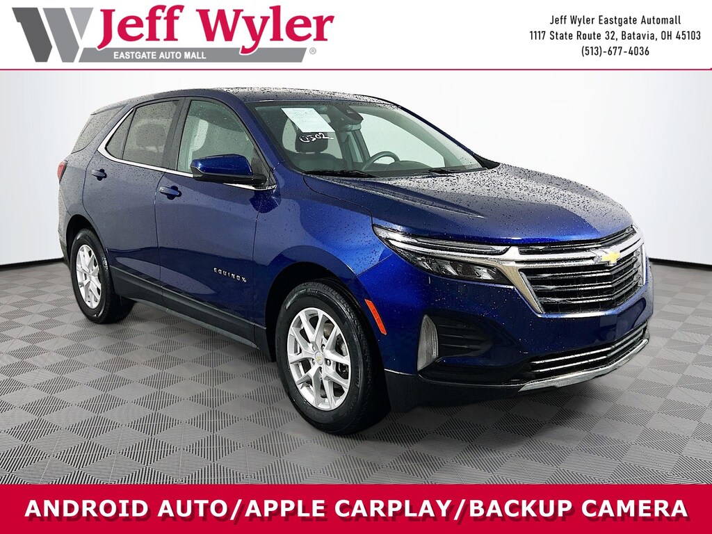 Jeff Wyler Eastgate Auto Mall is very proud to offer this attractive 2022 Chevrolet Equinox LT in Blue Glow Metallic. Well equipped with: Preferred Equipment Group 1LT, 17" Aluminum Wheels, 2 Rear USB Charging-Only Ports, 2 USB Ports & Auxiliary Input Jack, 2-Way Power Driver Lumbar Control Seat Adjuster, 3.50 Final Drive Axle Ratio, 4-Wheel Disc Brakes, 6 Speaker Audio System Feature, 6 Speakers, 8-Way Power Driver Seat Adjuster, ABS brakes, Air Conditioning, Alloy wheels, AM/FM radio: SiriusXM, Auto High-beam Headlights, Bluetooth® For Phone, Brake assist, Bumpers: body-color, Compass, Delay-off headlights, Driver door bin, Driver vanity mirror, Dual front impact airbags, Dual front side impact airbags, Electronic Stability Control, Emergency communication system: OnStar and Chevrolet connected services capable, Four wheel independent suspension, Front anti-roll bar, Front Bucket Seats, Front Center Armrest, Front Passenger 4-Way Manual Seat Adjuster, Front reading lights, Fully automatic headlights, Heated door mirrors, Illuminated entry, Low tire pressure warning, Occupant sensing airbag, Outside temperature display, Overhead airbag, Overhead console, Panic alarm, Passenger door bin, Passenger vanity mirror, Power door mirrors, Power driver seat, Power steering, Power windows, Premium audio system: Chevrolet Infotainment 3, Premium Cloth Seat Trim, Radio data system, Radio: Chevrolet Infotainment 3 System w/AM/FM, Rear anti-roll bar, Rear reading lights, Rear seat center armrest, Rear window defroster, Rear window wiper, Remote keyless entry, Security system, SiriusXM Radio, Speed control, Speed-sensing steering, Split folding rear seat, Spoiler, Steering wheel mounted audio controls, Tachometer, Telescoping steering wheel, Tilt steering wheel, Traction control, Trip computer, Variably intermittent wipers, and Wireless Apple CarPlay/Wireless Android Auto. CARFAX One-Owner. Clean CARFAX. Ask about available certifications. Used vehicles 10 years of age or newer with less than 100,000 miles are eligible for the Wyler Assurance Program, but eligible vehicles must pass our reconditioning process and multi-point inspection. Provided the vehicle passes inspection, vehicles will be eligible for the 6 month/6,000 mile limited warranty. The 6 month/6,000 mile limited warranty is NOT available on AS-IS vehicles, wholesale vehicles, lease buyback/pass-thru vehicles or un-inspected vehicles. Note that this program can also apply to vehicles where the remaining factory coverage is less than 6 months or 6,000 miles. Please check the Federal Trade Commission (FTC) Buyers guide on the vehicle for full details as to whether or not warranty coverage may apply. Contact Dealer for additional details. The Wyler Assurance 6 month/6,000 Mile limited warranty ends 6 months from the date of the Retail Purchase Agreement (BUYERS ORDER) or when the vehicle's odometer registers 6,000 additional miles to the mileage listed on the BUYERS ORDER, whichever comes first. Your Deductible - The warranty holder on your contract pays the first $100 of each covered repair.