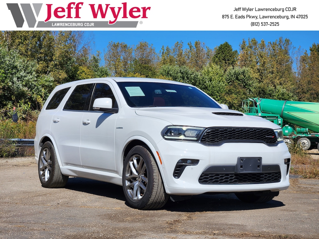 Jeff Wyler Chrysler Dodge Jeep of Lawrenceburg is pumped up to offer this beautiful 2022 Dodge Durango R/T in White Knuckle Clearcoat. Quick Order Package 22S R/T, Tow 'N Go Package (145 mph Maximum Speed Calibration, 160 mph Primary Speedometer, 7 & 4 Pin Wiring Harness, Active Noise Control System, Adaptive Damping, Automatic Headlamp Leveling System, Black Brembo Brakes, Class IV Receiver Hitch, Electronic Limited Slip Differential Rear Axle, Heavy-Duty Engine Cooling, High Perform Suspension, High Performance Exhaust, Performance Tuned Steering, Quadra-Trac Active on Demand 4WD, Run Flat Tires, Sport/Track/Tow/Snow Drive Modes, Trailer Brake Control, Upper/Lower Body Color Rear Fascia, and Wheels: 20" x 10" Hyper Black Aluminum), AWD, 2nd Row Fold/Tumble Captain Chairs, 2nd Row Mini Console w/Cupholders, 2nd Row Seat Mounted Inboard Armrests, 3.09 Rear Axle Ratio, 3rd row seats: split-bench, 4-Wheel Disc Brakes, 6-Passenger Seating, 9 Speakers, ABS brakes, Air Conditioning, Alloy wheels, AM/FM radio: SiriusXM w/360L, Anti-whiplash front head restraints, Apple CarPlay/Android Auto, Audio memory, Auto High-beam Headlights, Auto-dimming door mirrors, Auto-dimming Rear-View mirror, Auto-leveling suspension, Automatic temperature control, Brake assist, Bumpers: body-color, Compass, Delay-off headlights, Driver door bin, Driver vanity mirror, Dual front impact airbags, Dual front side impact airbags, Electronic Stability Control, Emergency communication system: SiriusXM Guardian, Four wheel independent suspension, Front anti-roll bar, Front Bucket Seats, Front Center Armrest w/Storage, Front dual zone A/C, Front fog lights, Front reading lights, Fully automatic headlights, Garage door transmitter, Heated door mirrors, Heated front seats, Heated rear seats, Heated steering wheel, Illuminated entry, Knee airbag, Leather steering wheel, Leather Suede Bucket Seats, Low tire pressure warning, Memory seat, Mini Console 3rd Row Floor Mat, Navigation system: TomTom, Occupant sensing airbag, Outside temperature display, Overhead airbag, Overhead console, Panic alarm, ParkView Rear Back-Up Camera, Passenger door bin, Passenger vanity mirror, Power door mirrors, Power driver seat, Power Liftgate, Power passenger seat, Power steering, Power Sunroof, Power windows, Radio data system, Radio: Uconnect 5 Nav w/10.1" Display, Rain sensing wipers, Rear air conditioning, Rear anti-roll bar, Rear Load Leveling Suspension, Rear reading lights, Rear seat center armrest, Rear window defroster, Rear window wiper, Remote keyless entry, Security system, Speed control, Speed-sensing steering, Speed-Sensitive Wipers, Split folding rear seat, Spoiler, Steering wheel mounted audio controls, Tachometer, Telescoping steering wheel, Tilt steering wheel, Traction control, Trip computer, Turn signal indicator mirrors, Variably intermittent wipers, Voltmeter, and Wheels: 20" x 8.0" Fine Silver Our PRE-OWNED vehicles are put through a rigorous 167- POINT QUALITY ASSURANCE INSPECTION along with an average amount of over $1,400.00 SPENT to recondition each vehicle so we can be sure to deliver you the highest quality vehicle like you deserve! ***ONLINE PRICE DOES NOT INCLUDE WYLER FAMILY FIRST PACKAGE*** Stop by 4136 Shelbyville Road to see for yourself, or give us a call @ 502-897-3151 to schedule your test drive! Ask about available certifications.