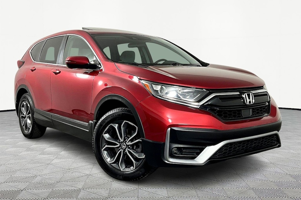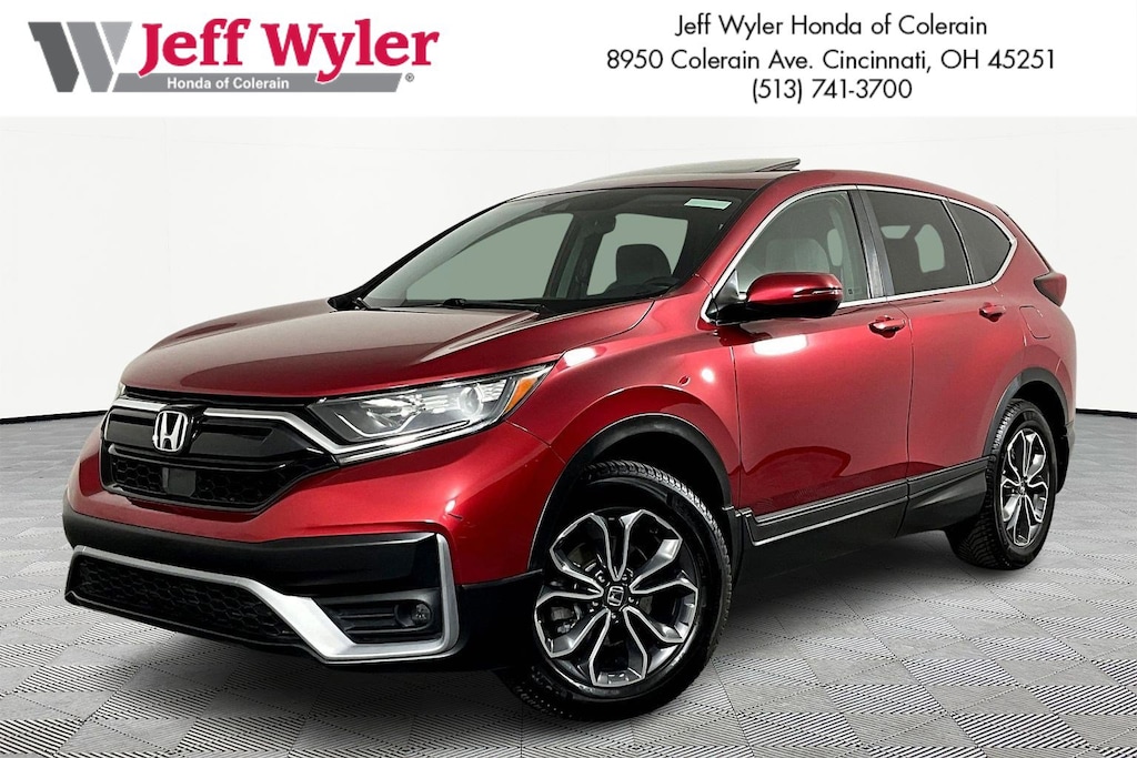 Jeff Wyler Honda of Colerain is pleased to offer this terrific-looking 2021 Honda CR-V EX in Radiant Red Metallic. Well equipped with: 18" Alloy Wheels, 4-Wheel Disc Brakes, 5.64 Axle Ratio, 6 Speakers, ABS brakes, Adaptive Cruise Control: Adaptive Cruise Control (ACC) with Low-Speed Follow, Air Conditioning, Alloy wheels, AM/FM radio: SiriusXM, Apple CarPlay/Android Auto, Auto High-beam Headlights, Automatic temperature control, Blind Spot Information (BSI) System warning, Brake assist, Bumpers: body-color, Cloth Seat Trim, Compass, Delay-off headlights, Driver door bin, Driver vanity mirror, Dual front impact airbags, Dual front side impact airbags, Electronic Stability Control, Exterior Parking Camera Rear, Forward collision: Collision Mitigation Braking System (CMBS) + FCW mitigation, Four wheel independent suspension, Front anti-roll bar, Front Bucket Seats, Front Center Armrest, Front dual zone A/C, Front fog lights, Front reading lights, Heated door mirrors, Heated Front Bucket Seats, Heated front seats, Illuminated entry, Low tire pressure warning, Occupant sensing airbag, Outside temperature display, Overhead airbag, Overhead console, Panic alarm, Passenger door bin, Passenger vanity mirror, Power door mirrors, Power driver seat, Power moonroof, Power steering, Power windows, Radio data system, Radio: 180-Watt AM/FM/HD/SiriusXM Audio System, Rear anti-roll bar, Rear seat center armrest, Rear window defroster, Rear window wiper, Remote keyless entry, Security system, Speed control, Speed-sensing steering, Speed-Sensitive Wipers, Split folding rear seat, Spoiler, Steering wheel mounted audio controls, Tachometer, Telescoping steering wheel, Tilt steering wheel, Traction control, Trip computer, Turn signal indicator mirrors, and Variably intermittent wipers.
