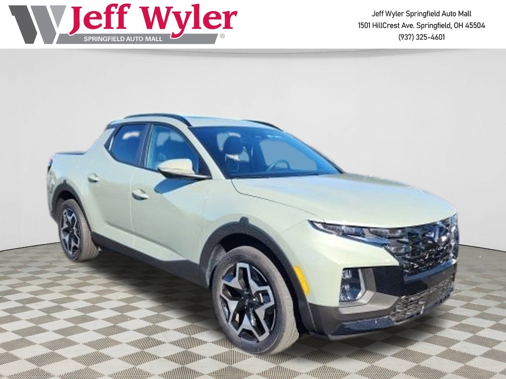 Jeff Wyler Springfield Auto Mall is pumped up to offer this terrific-looking 2024 Hyundai Santa Cruz Limited in Sage Gray. Well equipped with: Option Group 01, 3.316 Axle Ratio, 4-Wheel Disc Brakes, 8 Speakers, ABS brakes, Air Conditioning, Alloy wheels, AM/FM radio: SiriusXM, Apple CarPlay & Android Auto, Auto High-beam Headlights, Auto-dimming Rear-View mirror, Auto-leveling suspension, Automatic temperature control, Bed Cargo Net, Bed Mat, Brake assist, Bumpers: body-color, Carpeted Floor Mats, Delay-off headlights, Driver door bin, Driver vanity mirror, Dual front impact airbags, Dual front side impact airbags, Electronic Stability Control, Emergency communication system: Bluelink+, Exterior Parking Camera Rear, First Aid Kit, Four wheel independent suspension, Front anti-roll bar, Front Bucket Seats, Front Center Armrest, Front dual zone A/C, Front reading lights, Fully automatic headlights, Garage door transmitter: HomeLink, Heated & Ventilated Front Bucket Seats, Heated door mirrors, Heated front seats, Heated steering wheel, Illuminated entry, Leather Shift Knob, Leather steering wheel, Leather-Trimmed Seats, Low tire pressure warning, Navigation System, Occupant sensing airbag, Outside temperature display, Overhead airbag, Overhead console, Panic alarm, Passenger door bin, Passenger vanity mirror, Power door mirrors, Power driver seat, Power moonroof, Power steering, Power windows, Radio data system, Radio: AM/FM/HD w/Bose Premium Audio System, Rain sensing wipers, Rear anti-roll bar, Rear side impact airbag, Rear step bumper, Rear window defroster, Remote keyless entry, Roadside Assistance Kit, Security system, Speed control, Speed-sensing steering, Split folding rear seat, Spoiler, Steering wheel mounted audio controls, Tachometer, Telescoping steering wheel, Tilt steering wheel, Traction control, Trip computer, Turn signal indicator mirrors, Variably intermittent wipers, Ventilated front seats, and Wheels: 20" x 7.5J Alloy. Ask about available certifications. Used vehicles 10 years of age or newer with less than 100,000 miles are eligible for the Wyler Assurance Program, but eligible vehicles must pass our reconditioning process and multi-point inspection. Provided the vehicle passes inspection, vehicles will be eligible for the 6 month/6,000 mile limited warranty. The 6 month/6,000 mile limited warranty is NOT available on AS-IS vehicles, wholesale vehicles, lease buyback/pass-thru vehicles or un-inspected vehicles. Note that this program can also apply to vehicles where the remaining factory coverage is less than 6 months or 6,000 miles. Please check the Federal Trade Commission (FTC) Buyers guide on the vehicle for full details as to whether or not warranty coverage may apply. Contact Dealer for additional details. The Wyler Assurance 6 month/6,000 Mile limited warranty ends 6 months from the date of the Retail Purchase Agreement (BUYERS ORDER) or when the vehicle's odometer registers 6,000 additional miles to the mileage listed on the BUYERS ORDER, whichever comes first. Your Deductible - The warranty holder on your contract pays the first $100 of each covered repair.
