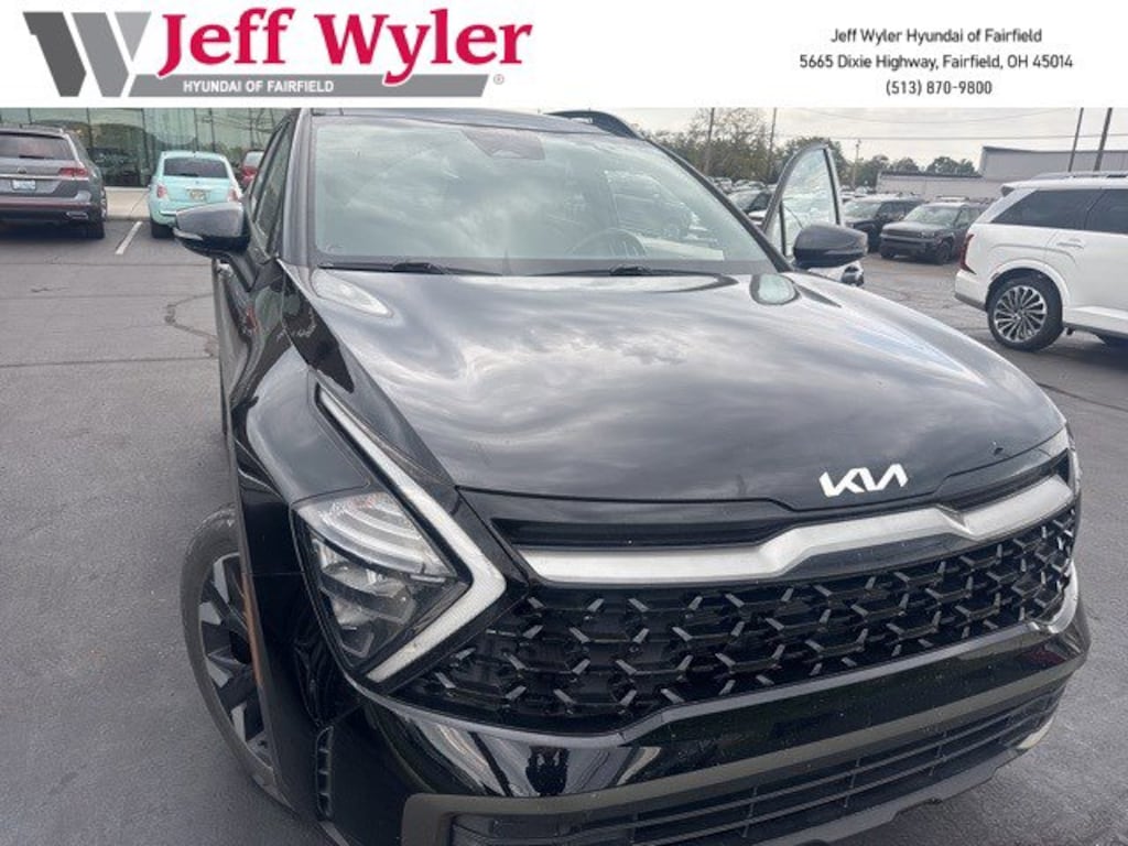 CARFAX One-Owner. Jeff Wyler Hyundai of Fairfield is proud to offer this superb-looking 2023 Kia Sportage X-Line in Ebony Black. Well equipped with: Sage Green Interior Color Package, X-Line Premium Package (LED Interior Lighting, Panoramic Sunroof, and Smart Power Liftgate), AWD, Android Auto, Apple CarPlay, CALL NOW FOR YOUR VIP APPOINTMENT 513-870-9800, FULLY SERVICED w/RECORDS, GUARANTEED FINANCING!! NO MATTER YOUR SITUATION WE CAN GET AN APPROVAL!!, THE #1 Volume dealer in the region! Come see why for yourself Today!!, WE PAY MORE FOR YOUR TRADE!!, 4-Wheel Disc Brakes, 6 Speakers, ABS brakes, Air Conditioning, Alloy wheels, AM/FM radio: SiriusXM, Apple CarPlay & Android Auto, Auto High-beam Headlights, Automatic temperature control, Axle Ratio: 3.648, Brake assist, Bumpers: body-color, Cargo Cover, Cargo Net Hybrid w/o Audio, Compass, Delay-off headlights, Driver door bin, Driver vanity mirror, Dual front impact airbags, Dual front side impact airbags, Electronic Stability Control, Emergency communication system, Four wheel independent suspension, Front anti-roll bar, Front Bucket Seats, Front Center Armrest, Front dual zone A/C, Fully automatic headlights, harman/kardon® Speakers, Heated door mirrors, Heated Front Bucket Seats, Heated front seats, Illuminated entry, Leather Shift Knob, Leather steering wheel, Low tire pressure warning, Navigation System, Occupant sensing airbag, Outside temperature display, Overhead airbag, Overhead console, Panic alarm, Passenger door bin, Passenger vanity mirror, Power door mirrors, Power driver seat, Power steering, Power windows, Premium Leatherette Seat Trim, Radio: AM/FM/HD Audio System, Rain sensing wipers, Rear anti-roll bar, Rear seat center armrest, Rear window defroster, Rear window wiper, Remote keyless entry, Security system, Speed control, Speed-sensing steering, Split folding rear seat, Spoiler, Steering wheel mounted audio controls, Tachometer, Telescoping steering wheel, Tilt steering wheel, Traction control, Trip computer, Turn signal indicator mirrors, Variably intermittent wipers, Wheel Locks, and Wheels: 19" Gloss Black Alloy. TO CHECK ON THE AVAILABILITY OF THIS VEHICLE REACH OUT TO ONE OF OUR TEAM MEMBERS!! ALSO SHOP ONLINE AT https://www.jeffwylerhyundaioffairfield.com/ Proudly Serving: Cincinnati, Dayton, Columbus, Louisville, Lexington, Indianapolis, Hamilton, Florence, Alexandria, Beavercreek, Springdale, West Chester, Monroe, Fairfield, Kenwood, Newport and all of greater Cincinnati Ohio, Indiana, and Northern Kentucky.