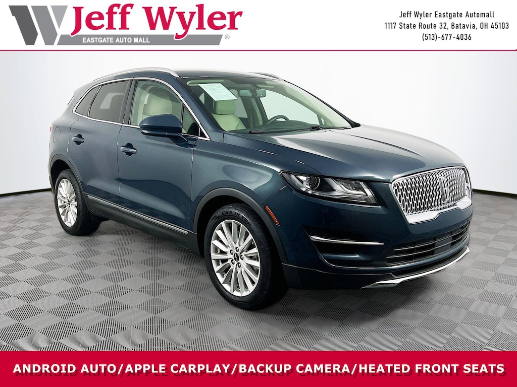 Jeff Wyler Eastgate Auto Mall is excited to offer this great 2019 Lincoln MKC Standard in Sea Green. Well equipped with: Equipment Group 100A, 10 Speakers, 18" Painted Aluminum Wheels, 3.36 Axle Ratio, 4-Wheel Disc Brakes, ABS brakes, Air Conditioning, Alloy wheels, AM/FM radio: SiriusXM, AppLink/Apple CarPlay and Android Auto, Auto-dimming Rear-View mirror, Automatic temperature control, Brake assist, Bumpers: body-color, CD player, Compass, Delay-off headlights, Driver door bin, Driver vanity mirror, Dual front impact airbags, Dual front side impact airbags, Electronic Stability Control, Emergency communication system: SYNC 3 911 Assist, Exterior Parking Camera Rear, Four wheel independent suspension, Front anti-roll bar, Front Bucket Seats, Front Center Armrest, Front dual zone A/C, Front reading lights, Fully automatic headlights, Heated door mirrors, Heated front seats, Illuminated entry, Knee airbag, Lincoln Soft Touch Bucket Seats, Low tire pressure warning, Memory seat, Occupant sensing airbag, Outside temperature display, Overhead airbag, Overhead console, Panic alarm, Passenger door bin, Passenger vanity mirror, Power door mirrors, Power driver seat, Power Liftgate, Power passenger seat, Power steering, Power windows, Radio data system, Radio: Audio System w/Single CD/MP3, Rear anti-roll bar, Rear reading lights, Rear seat center armrest, Rear window defroster, Rear window wiper, Remote keyless entry, Roof rack: rails only, Security system, SiriusXM Radio, Speed control, Speed-sensing steering, Speed-Sensitive Wipers, Split folding rear seat, Spoiler, Steering wheel mounted audio controls, SYNC 3 Communications & Entertainment System, Tachometer, Telescoping steering wheel, Tilt steering wheel, Traction control, Trip computer, and Variably intermittent wipers. CARFAX One-Owner. Clean CARFAX. Ask about available certifications. Used vehicles 10 years of age or newer with less than 100,000 miles are eligible for the Wyler Assurance Program, but eligible vehicles must pass our reconditioning process and multi-point inspection. Provided the vehicle passes inspection, vehicles will be eligible for the 6 month/6,000 mile limited warranty. The 6 month/6,000 mile limited warranty is NOT available on AS-IS vehicles, wholesale vehicles, lease buyback/pass-thru vehicles or un-inspected vehicles. Note that this program can also apply to vehicles where the remaining factory coverage is less than 6 months or 6,000 miles. Please check the Federal Trade Commission (FTC) Buyers guide on the vehicle for full details as to whether or not warranty coverage may apply. Contact Dealer for additional details. The Wyler Assurance 6 month/6,000 Mile limited warranty ends 6 months from the date of the Retail Purchase Agreement (BUYERS ORDER) or when the vehicle's odometer registers 6,000 additional miles to the mileage listed on the BUYERS ORDER, whichever comes first. Your Deductible - The warranty holder on your contract pays the first $100 of each covered repair.