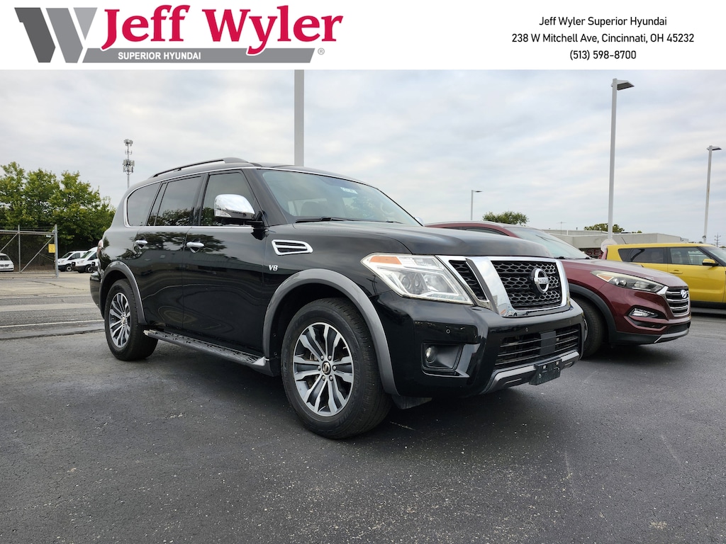 Jeff Wyler Superior Hyundai is excited to offer this attractive-looking 2019 Nissan Armada SL in Super Black. Well equipped with: Premium Package (Blind Spot Warning, Intelligent Back-Up Intervention (I-BI), Intelligent Distance Control (I-DC), Power Sliding Moonroof w/Front Tilt & Rear Slide, and Rear Cross Traffic Alert (RCTA)), 4WD, 13 Speakers, 2.937 Axle Ratio, 2nd & 3rd Row Carpeted Mats, 3rd row seats: split-bench, 4-Wheel Disc Brakes, ABS brakes, Air Conditioning, Alloy wheels, AM/FM radio: SiriusXM, Anti-whiplash front head restraints, Auto tilt-away steering wheel, Auto-dimming door mirrors, Auto-dimming Rear-View mirror, Auto-leveling suspension, Automatic temperature control, Brake assist, Bumpers: body-color, CD player, Delay-off headlights, Driver door bin, Driver vanity mirror, Dual front impact airbags, Dual front side impact airbags, Electronic Stability Control, Emergency communication system: NissanConnect Services, Four wheel independent suspension, Front anti-roll bar, Front Bucket Seats, Front Center Armrest, Front dual zone A/C, Front fog lights, Front reading lights, Fully automatic headlights, Garage door transmitter: HomeLink, Heated door mirrors, Heated Front Bucket Seats w/Driver Memory, Heated front seats, Illuminated entry, Leather Shift Knob, Leather-Appointed Seat Trim, Low tire pressure warning, Memory seat, Navigation System, Occupant sensing airbag, Outside temperature display, Overhead airbag, Overhead console, Panic alarm, Passenger door bin, Passenger vanity mirror, Power door mirrors, Power driver seat, Power Liftgate, Power passenger seat, Power steering, Power windows, Radio data system, Radio: AM/FM/SXM/CD/MP3/HD, Rain sensing wipers, Rear air conditioning, Rear anti-roll bar, Rear reading lights, Rear seat center armrest, Rear window defroster, Rear window wiper, Reclining 3rd row seat, Remote keyless entry, Roof rack: rails only, Security system, Speed control, Speed-sensing steering, Speed-Sensitive Wipers, Split folding rear seat, Spoiler, Steering wheel memory, Steering wheel mounted audio controls, Tachometer, Telescoping steering wheel, Tilt steering wheel, Traction control, Trip computer, Turn signal indicator mirrors, Variably intermittent wipers, Voltmeter, and Wheels: 20" Machined Finish Painted Alloy. This sales price excludes tax, title, and dealer fees. While every reasonable effort is made to ensure the accuracy of this information, we are not responsible for any errors or omissions contained on these pages. Used vehicles 10 years of age or newer with less than 100,000 miles are eligible for the Wyler Assurance Program, but eligible vehicles must pass our reconditioning process and multi-point inspection. Provided the vehicle passes inspection, vehicles will be eligible for the 6 month/6,000 mile limited warranty. The 6 month/6,000 mile limited warranty is NOT available on AS-IS vehicles, wholesale vehicles, lease buyback/pass-thru vehicles or un-inspected vehicles. Note that this program can also apply to vehicles where the remaining factory coverage is less than 6 months or 6,000 miles. Please check the Federal Trade Commission (FTC) Buyers guide on the vehicle for full details as to whether or not warranty coverage may apply. Contact Dealer for additional details. The Wyler Assurance 6 month/6,000 Mile limited warranty ends 6 months from the date of the Retail Purchase Agreement (BUYERS ORDER) or when the vehicle's odometer registers 6,000 additional miles to the mileage listed on the BUYERS ORDER, whichever comes first.Your Deductible - The warranty holder on your contract pays the first $100 of each covered repair.