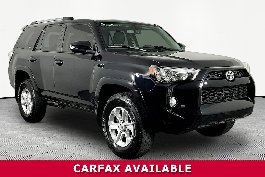 Jeff Wyler Eastgate Auto Mall is proud to offer this outstanding-looking 2019 Toyota 4Runner SR5 Premium in Midnight Black Metallic. Well equipped with: 17" x 7.0" 6-Spoke Alloy Wheels, ABS brakes, Alloy wheels, Body Color Heated Mirrors, Compass, Electronic Stability Control, Heated door mirrors, Heated Front Bucket Seats, Heated front seats, Illuminated entry, Low tire pressure warning, Remote keyless entry, Traction control, 3.727 Axle Ratio, 4-Wheel Disc Brakes, 8 Speakers, Air Conditioning, AM/FM radio: SiriusXM, Anti-whiplash front head restraints, Auto-Dimming Rear-View Mirror, Auto-dimming Rear-View mirror, Brake assist, Bumpers: body-color, CD player, Driver door bin, Driver vanity mirror, Dual front impact airbags, Dual front side impact airbags, Emergency communication system: Safety Connect, Exterior Parking Camera Rear, Front anti-roll bar, Front Bucket Seats, Front Center Armrest, Front fog lights, Front reading lights, Front wheel independent suspension, Garage Door Opener, Garage door transmitter: HomeLink, Knee airbag, Leather Shift Knob, Leather steering wheel, Occupant sensing airbag, Outside temperature display, Overhead airbag, Overhead console, Panic alarm, Passenger door bin, Passenger vanity mirror, Power door mirrors, Power driver seat, Power passenger seat, Power steering, Power windows, Radio: Entune Premium Audio w/Navigation, Rear anti-roll bar, Rear seat center armrest, Rear window defroster, Rear window wiper, Roof rack: rails only, Security system, Softex Synthetic Leather Seat Trim, Speed control, Speed-sensing steering, Split folding rear seat, Spoiler, Steering wheel mounted audio controls, Tachometer, Telescoping steering wheel, Tilt steering wheel, Trip computer, Turn signal indicator mirrors, and Variably intermittent wipers. Awards: * 2019 KBB.com Best Resale Value Awards * 2019 KBB.com Brand Image Awards Ask about available certifications. Used vehicles 10 years of age or newer with less than 100,000 miles are eligible for the Wyler Assurance Program, but eligible vehicles must pass our reconditioning process and multi-point inspection. Provided the vehicle passes inspection, vehicles will be eligible for the 6 month/6,000 mile limited warranty. The 6 month/6,000 mile limited warranty is NOT available on AS-IS vehicles, wholesale vehicles, lease buyback/pass-thru vehicles or un-inspected vehicles. Note that this program can also apply to vehicles where the remaining factory coverage is less than 6 months or 6,000 miles. Please check the Federal Trade Commission (FTC) Buyers guide on the vehicle for full details as to whether or not warranty coverage may apply. Contact Dealer for additional details. The Wyler Assurance 6 month/6,000 Mile limited warranty ends 6 months from the date of the Retail Purchase Agreement (BUYERS ORDER) or when the vehicle's odometer registers 6,000 additional miles to the mileage listed on the BUYERS ORDER, whichever comes first. Your Deductible - The warranty holder on your contract pays the first $100 of each covered repair.