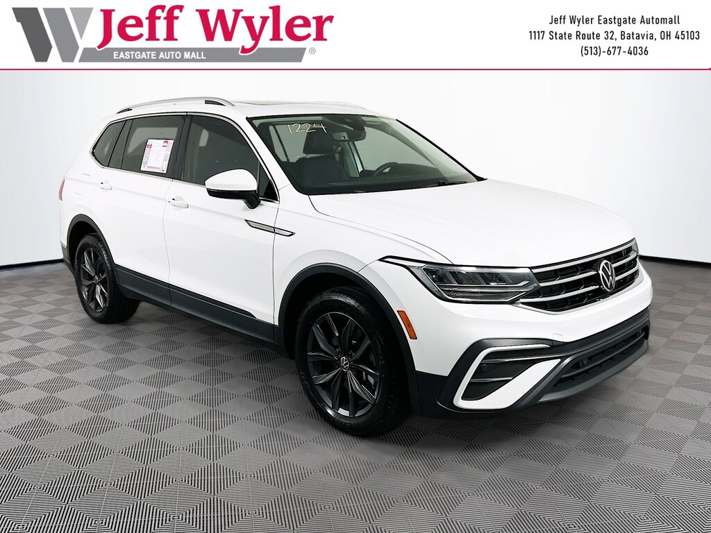 Jeff Wyler Eastgate Auto Mall is very proud to offer this handsome-looking 2022 Volkswagen Tiguan 2.0T SE in Pure White. Well equipped with: Panoramic Sunroof Package, 3-Row Rubber Monster Mats w/Logo Kit (Set of 5), 3.33 Axle Ratio, 3rd row seats: bench, 4-Wheel Disc Brakes, 4-Wheel Independent Suspension, 6 Speakers, ABS brakes, Air Conditioning, Alloy wheels, AM/FM radio: SiriusXM with 360L, Auto-Dimming Rear-View Mirror, Auto-dimming Rear-View mirror, Automatic temperature control, Brake assist, Bumpers: body-color, Compass, Delay-off headlights, Driver door bin, Driver vanity mirror, Dual front impact airbags, Dual front side impact airbags, Electronic Stability Control, Emergency communication system: Car-Net, Exterior Parking Camera Rear, First Aid Kit, Four wheel independent suspension, Front anti-roll bar, Front Bucket Seats, Front Center Armrest, Front dual zone A/C, Front reading lights, Fully automatic headlights, Heated door mirrors, Heated Front Comfort Seats, Heated front seats, Heavy Duty Trunk Liner w/VW CarGo Blocks, Illuminated entry, Leather Shift Knob, Low tire pressure warning, Occupant sensing airbag, Outside temperature display, Overhead airbag, Overhead console, Panic alarm, Passenger door bin, Passenger vanity mirror, Perforated V-Tex Leatherette Seating Surfaces, Power door mirrors, Power driver seat, Power Liftgate, Power Rear Liftgate Delete, Power steering, Power windows, Radio data system, Radio: MIB3 Composition Media AM/FM/HD, Rain sensing wipers, Rear anti-roll bar, Rear reading lights, Rear seat center armrest, Rear window defroster, Rear window wiper, Remote keyless entry, Roadside Assistance Kit, Roof rack: rails only, Security system, Speed control, Speed-sensing steering, Split folding rear seat, Spoiler, Steering wheel mounted audio controls, Tachometer, Telescoping steering wheel, Tilt steering wheel, Traction control, Trip computer, Turn signal indicator mirrors, Variably intermittent wipers, and Wheels: 18" Dark Graphite 10-Spoke Alloy. CARFAX One-Owner. Clean CARFAX. Ask about available certifications. Used vehicles 10 years of age or newer with less than 100,000 miles are eligible for the Wyler Assurance Program, but eligible vehicles must pass our reconditioning process and multi-point inspection. Provided the vehicle passes inspection, vehicles will be eligible for the 6 month/6,000 mile limited warranty. The 6 month/6,000 mile limited warranty is NOT available on AS-IS vehicles, wholesale vehicles, lease buyback/pass-thru vehicles or un-inspected vehicles. Note that this program can also apply to vehicles where the remaining factory coverage is less than 6 months or 6,000 miles. Please check the Federal Trade Commission (FTC) Buyers guide on the vehicle for full details as to whether or not warranty coverage may apply. Contact Dealer for additional details. The Wyler Assurance 6 month/6,000 Mile limited warranty ends 6 months from the date of the Retail Purchase Agreement (BUYERS ORDER) or when the vehicle's odometer registers 6,000 additional miles to the mileage listed on the BUYERS ORDER, whichever comes first. Your Deductible - The warranty holder on your contract pays the first $100 of each covered repair.